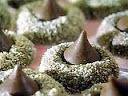 3. Roll each ball in almonds to coat. Place balls on a cookie sheet. Using your finger, make a deep indentation in the center of each ball. Fill the indentations with chocolate kiss candies. Refrigerate for 30 minutes, or until cold.
