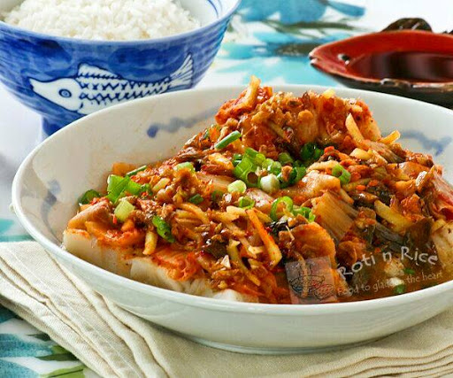 Place cod on a shallow bowl. Sprinkle salt, pepper, and ginger all over the cod. Place sliced kimchi on the top.