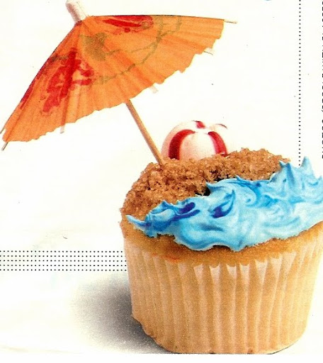 Start with a mix or store-bought cupcakes. Sprinkle frosting with "sand" (brown sugar) and top with paper umbrellas. We added a beach ball ( round peppermint candy) and whipped up some waves with food coloring.