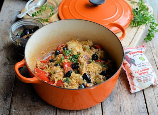 Add the stock and smoked paprika, and place a lid on the pot/pan. Simmer over a very low heat, with the lid on, for 45 minutes, or until the chicken is cooked and tender and the rice is soft and has absorbed all the liquid.