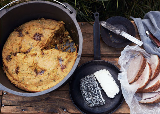 Meanwhile, whisk flour, cornmeal, sugar, baking soda, salt, and baking powder in a large bowl. Whisk eggs and milk in a medium bowl; add to cornmeal mixture along with reserved melted butter and whisk to combine. Scrape batter into hot Dutch oven.