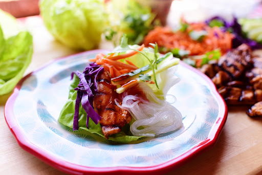 For the lettuce and fillings: Set out the lettuce, bean sprouts, cabbage, carrots, cucumbers and rice noodles on the serving platter.