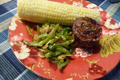 Cut the rolled up steak into 2 or 3 pinwheel pieces depending upon your choice. The finished product are tied pinwheel about 1-1/2 to 2 inches wide and 1-1/2 inches high (+-).
