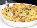 Place the bread slices in a food processor fitted with a steel blade and pulse until you have coarse crumbs. Add the basil and pulse to combine. Sprinkle the bread crumb mixture over the top of the pasta. Bake for 35 to 40 minutes, or until the sauce is bubbly and the macaroni is browned on the top.