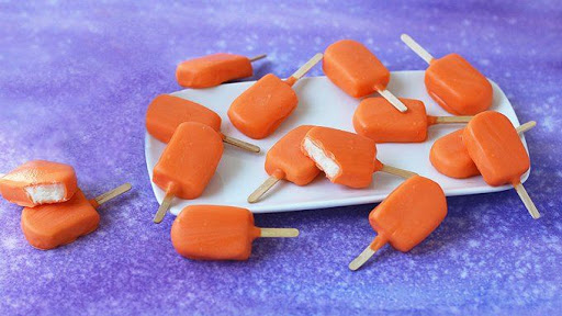 Dip vanilla cream candies in the melted orange candy coating, then set on a parchment-lined baking sheet.