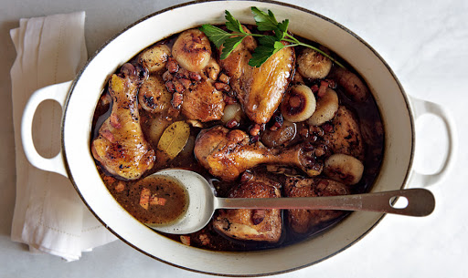 Carefully drain fat from pot and return to medium-high heat. Add both vinegars to pot and bring to a boil, stirring and scraping up any browned bits from bottom of pot. Add broth, raisins, bay leaves, and reserved chicken, pancetta, onions, and garlic to pot. Bring to a boil, reduce heat, and simmer, partially covered, until chicken is fork-tender, 35-40 minutes.