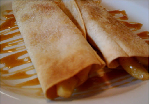 Meanwhile, saute apples in remaining butter in skillet over high heat with 1 T sugar, until browned and tender (or just dump the rest of your cinnamon sugar mixture in there with them!). Add in lemon juice. Remove browned tortilla tubes from oven and spoon apple mixture into them. Sit down and eat yours while you listen to moans of happiness from your guests.