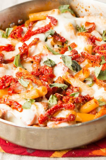 Top the skillet with cheese and place under the broiler for 1-2 minutes or until the cheese is melted and browning slightly in spots. Remove the skillet from the oven and top with sun-dried tomatoes and basil. Serve immediately.