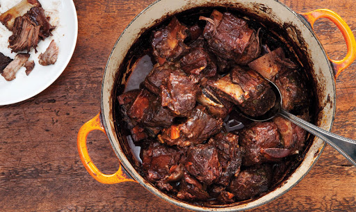 Preheat oven to 350°. Season short ribs with salt and pepper. Heat oil in a large Dutch oven over medium-high. Working in 2 batches, brown short ribs on all sides, about 8 minutes per batch. Transfer short ribs to a plate. Pour off all but 3 Tbsp. drippings from pot.