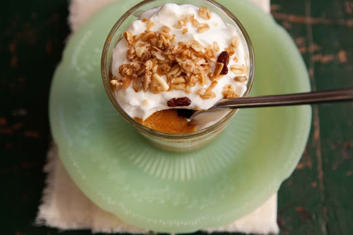 In a bowl or glass, make alternating layers of the pumpkin-spice mix and the yogurt until you've used them up. Then, sprinkle a little granola on top if you want a touch of crunch. Serve.