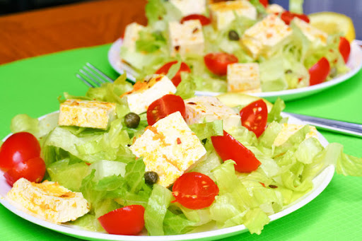 Toss the chopped romaine lettuce with the lemon vinaigrette. Divide the lettuce among 6 individual salad plates. Drain the tofu and capers from the liquid and then arrange on top of the salad. Serve at room temperature.