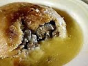 Pastry: Meanwhile, make the pastry. Sift the flour and salt into a mixing bowl and make a well in the center. Dice the butter, put it into a saucepan with water and bring to a boil. Pour the liquid all at once into the flour and mix together quickly; beat until smooth. At first the pastry will be too soft to handle but as soon as it cools it may be rolled out to 1/3 to 1/4- inch (2.5 to 5 millimeters) thick, to fit the 2 tins. The pastry may be made into individual pies or 1 large pie. Keep back 1/3 of the pastry for lids.