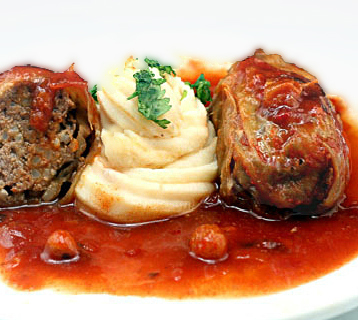 Mix the ground beef with the eggs, grated onion, garlic, salt, pepper, and rice. (If you use cooked rice, you can test the seasoning of the meat mixture to your liking by frying up or microwaving a piece of it and tasting, if desired). Divide this mixture into sixteen 2-ounce balls. Using moistened hands, form the balls into cylinders. Place a cylinder of filling near the bottom of a cabbage leaf (if the vein in the leaf is really thick, shave it down with a knife before placing the beef on it, being careful not to cut through the leaf itself.). Begin to roll it up, folding both sides over the filling, and finish rolling to enclose the filling, like an eggroll. Continue, filling and rolling all the cabbage leaves. Place them, seam side down, on a tray or baking sheet. Cover and refrigerate until ready to use.