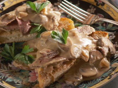 Place a piece of toast on each plate. Slice the beef against the grain and place some on top of the toast. Spoon the sauce on top and garnish with some parsley.