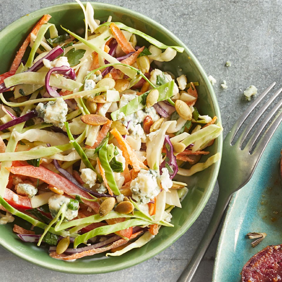 Crumbled blue cheese in a buttermilk dressing elevates basic coleslaw and is a perfect way to introduce kids to the potent cheese. Top with grilled chicken or pork for a fast and easy meal-in-a-bowl.