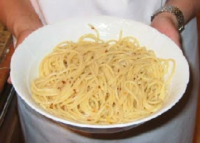 Mientras el spaguetti se cocina, en una cacerola pequeña ponga el aceite de oliva, el ajo y el pimiento y cocine a fuego mediano hata que el ajo adquiera un color dorado palido.