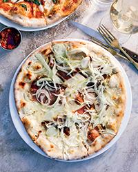 and nutmeg. Top with half of the cheddar, speck and onion. Slide the parchment paper onto the hot pizza stone and bake until the pizza is crisp, about 10 minutes. Transfer to a work surface, cut into wedges and serve hot. Repeat with the remaining dough round and toppings.