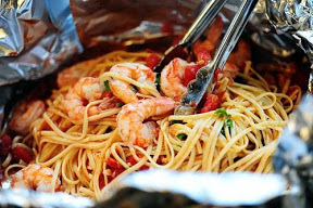 Throw the shrimp on the top of the pasta sauce. Throw the drained pasta over the top, then pour the whole dish onto the foil. Tightly wrap the foil into a parcel.