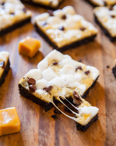An Oreo cookie-crumb and buttery crust is topped with marshmallows, caramels, and chocolate chips for an easy and fast dessert reminiscent of s'mores. As the bars bake, the marshmallows puff and become gooey and the rich and buttery caramels melt, providing plenty of texture and diverse flavors in each bite. The chocolate chips sprinkled on top boost the chocolate intensity, always a good thing.