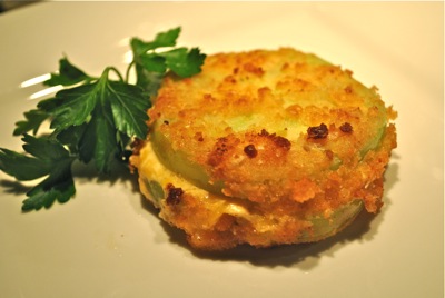Set up three bowls: one with flour, one with a beaten egg, and one with a sleeve of finely crushed Ritz crackers. Dredge your stuffed green tomato slices in flour, be sure to coat all sides. Shake off the excess. Dip both sides of the floured tomato in the egg. Now dip the tomato in your Ritz cracker crumbs and coat all sides. If you would like a thicker breading, simply repeat the process starting with the flour.