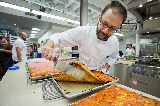 In order to create a Sicilian pie with a creamy, golden interior and a delicate, crisp bottom, we use a mixture of semolina and all-purpose flours. To give it a fine-textured, almost cake-like crumb, we use a three-pronged approach. We use a generous amount of olive oil in the dough to tenderize it, we cold-ferment the dough overnight to let flavors develop without large bubbles forming, and then we roll it out and weigh it down with another baking sheet during the final proof to keep the crumb even and tight. Finally, we top it with a concentrated and complex long-cooked tomato sauce and a mixture of cheeses, a combination that stands up to the thickness of the crust below.