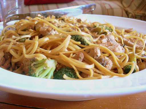 Agregue los fideos, brotes, carne y el consomé a los vegetales y combine por un minuto o hasta que los fideos estén calientes. Sirva