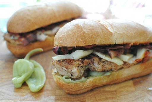 Arrange the sliced chicken breast along the bottom half. Then goes the sliced cheese. Then the bacon. Oh, my.