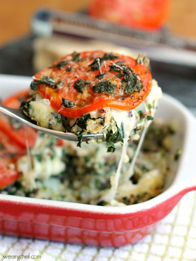 Transfer quinoa mixture to prepared baking dish. Arrange slices or cubes of mozzarella over the top, and place tomato slices in an even layer over the cheese. Sprinkle basil over the tomatoes. Drizzle a small amount of olive oil over the tomatoes, and sprinkle remaining ¼ c. parmesan over the top.
