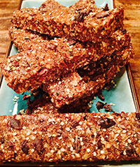 Place Flax seed meal,oats,seeds,dried fruit, and cacao nibs in the food processor