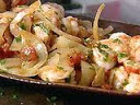Toss the shrimp in a medium bowl with 1 teaspoon of salt and red pepper flakes. Heat the 3 tablespoons oil in a heavy large skillet over medium-high heat. Add the shrimp and saute for about a minute, toss, and continue cooking until just cooked through, about 1 to 2 minutes. Transfer the shrimp to a large plate; set aside. Add the onion to the same skillet, adding 1 to 2 teaspoons of olive oil to the pan, if necessary, and saute until translucent, about 5 minutes. Add the tomatoes with their juices, wine, garlic, and oregano. Simmer until the sauce thickens slightly, about 10 minutes. Return the shrimp and any accumulated juices to the tomato mixture; toss to coat, and cook for about a minute so the flavors meld together. Stir in the parsley and basil. Season with more salt, to taste, and serve.