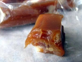 # Lift the pan liner from the pan and invert the sheet of caramel onto a sheet of parchment paper. Peel of the liner and turn the caramel right side up. Cut the caramel into desired size. Wrap individually in wax paper or cellophane.