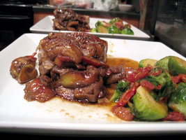 4. Remove the sous vide pork chops from their pouches, reserving the liquid. Quickly sear the pork chops on both sides in a pan over high heat, or on a grill. While the chops are searing finish the sauce.