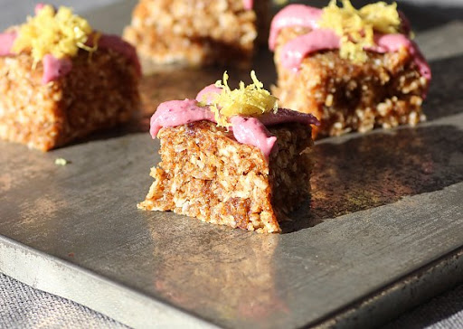 9. Enjoy your raw lemon bars! Their lemony coconut flavor goes really well with fresh or thawed strawberries. They should be stored in the refrigerator.
