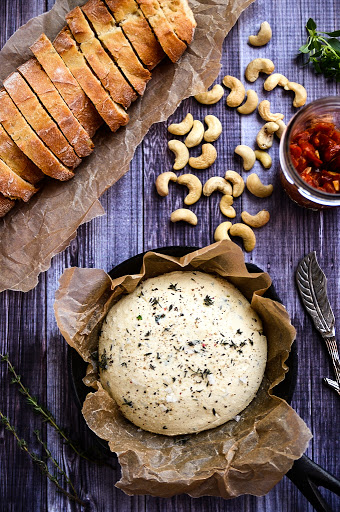 Once refrigerated, unwrap the cashew cheese, transfer it to a serving platter, and garnish with sea salt, black pepper, and chopped herbs.