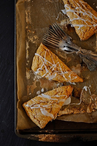 When the scones have cooled slightly, brush them with a coating of plain glaze and allow them to dry completely – for about 1 hour. Then drizzle with the spiced glaze.