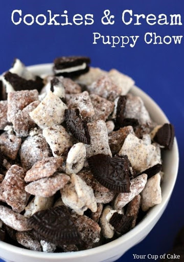 8. Once cooled, mix the "Cookies" and "Cream" Puppy Chow together and fold in extra chopped Oreos.