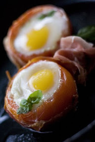 Preheat your oven to 350F. Cut the top of the tomatoes with a sharp knife and gently scoop out the the seeds and juices with a spoon. Lay them upside down on a couple sheet of paper towels to soak up extra moistness. In the meantime, using a mortar and pestle, smash the basil until it forms a paste. Add a pinch of salt, and drizzle a little olive oil to loosen the basil. Add some black pepper. Check that the tomatoes are dry inside, and dab the inside with an extra paper towel. Wrap a slice of prosciutto around the tomato, and, using a toothpick, seal both ends so they fit snugly around the tomato. Smear some of the basil paste inside the tomato.