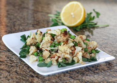 Combine the roasted cauliflower with the cooked quinoa and peas, the toasted almonds, sliced green onions, and 2 tablespoons of lemon juice. Taste and adjust seasonings. Add more lemon juice if desired.