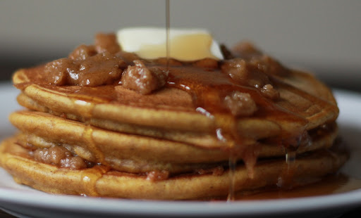 3. For each pancake, pour 1/4 cupful batter onto hot griddle. Sprinkle each pancake evenly with scant 2 tablespoons Streusel mixture. Cook 2 to 3 minutes or until bubbly on top and dry around edges. Turn; cook other side until light golden brown around edges about 1 minute to 1 minute 30 seconds. Scrape off griddle between batches of pancakes if necessary.