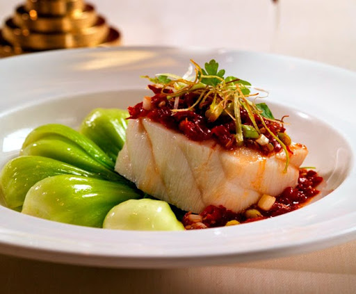 Bring the chopped garlic shallots, red jalapeño and put in the seasoning and mix well. Add these over the sea bass, put them (the sea bass & bok choy) into the steam for 12 minutes. Remove and add green onion and cilantro.