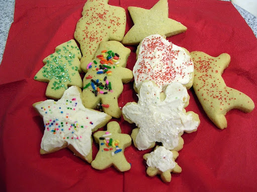 Mix all ingredients together and roll out on a floured surface. Roll them 1/2 to 1/4 thick. Bake at 375 for 10-12 minutes or until edges start getting brown. When cooled frost and decorate. You can also put sprinkles on top and then bake them.