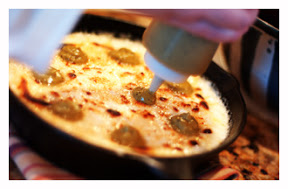 3. Scrape the mixture into an 8-inch cast-iron pan and place the slices of goat cheese over the top. Put the pan under the broiler and broil until the goat cheese is golden brown on top. Remove from the oven, drizzle with the poblano vinaigrette or spoon it over the top, and sprinkle with the chopped cilantro. Serve with chips for dipping.