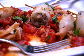Secure the ends crosswise with toothpicks (when the squid cooks, it shrinks and this prevents the stuffing from oozing out).