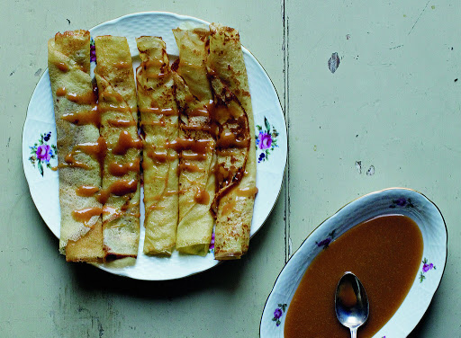 Roll the crêpes and serve them, about 5 per person, on individual plates, drizzled with the salted butter caramel.