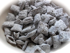 Pour chocolate mixture over cereal and stir well to coat all pieces. Add powdered sugar and shake until completely coated, I like to add more sugar to really coat the cereal. Store in an airtight container at room temp, or in the fridge.