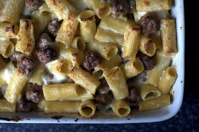Assemble the dish: Cook the rigatoni in a pot of well salted water. Drain when still al dente, and combine immediately in bowl with two-thirds of the bèchamel, half the grated cheese, and all the meatballs.