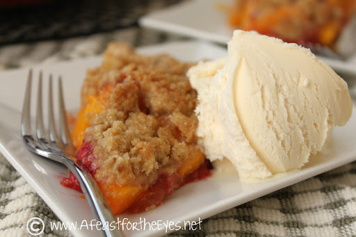 I love Peach Melba dessert, that is simply sliced peaches and a fresh raspberry sauce served over vanilla ice cream. Why not make it a pie? What a great idea that turned out to be. I made an all-butter crust, and a streusel with just a touch of cinnamon. Add a scoop of vanilla ice cream, and there's a summer dessert that you will love. Frozen peach slices and frozen raspberries work fine, as well, so you can make this any time of year. This is an ORIGINAL recipe from my food blog, "A Feast for the Eyes".