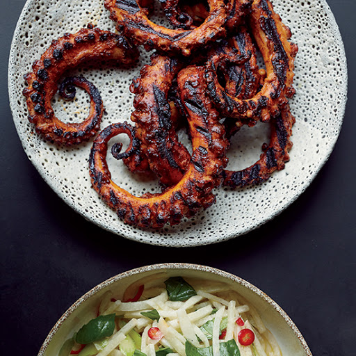 Light a grill or preheat a grill pan and brush with canola oil. Grill the octopus over high heat, turning, until lightly charred all over, about 4 minutes. Transfer to a baking sheet and immediately brush with some of the ancho chile sauce. Serve with the jicama salad, passing the remaining sauce at the table.