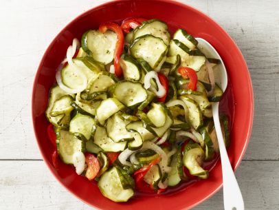 In a large bowl, toss the sliced cucumbers, onion and bell pepper with the liquid mixture and refrigerate overnight. Serve cold.