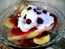 In a separate dish, mix strawberry preserves with 1 tablespoon of hot water to create a strawberry syrup. Pour strawberry syrup over bananas.